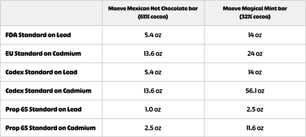 - This chart indicates how many ounces of the bar one would need to consume to meet the standards listed. For example, to meet the FDA Standard on Lead, one would have to eat 5.4 oz, the equivalent of 2 bars, of the Maeve Mexican Hot Chocolate truffle bar. FDA, EU and Codex standards are based on a per oz basis.